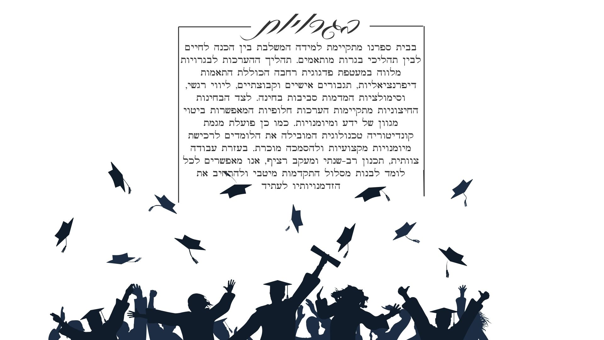 בית ספרנו מהווה מסגרת ייחודית להכנה לחיים עבור תלמידים עם צרכים מיוחדים, ומשלב בין למידה משמעותית לבין הזדמנויות להשגת הישגים לימודיים. לצד ההכשרה המעשית חברתית שהיא חלק ממסגרת הליבה של בית הספר, אנו רואים במסלול הבגרויות נדבך מרכזי בבניית תחושת המסוגלות והעצמת עתידם של תלמידינו.